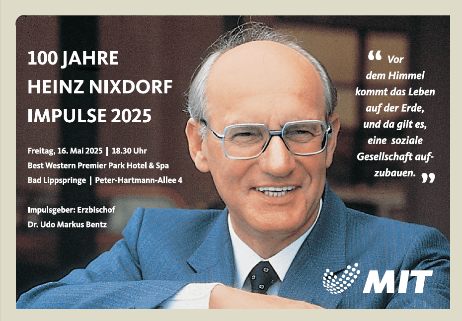 Zum 100. Geburtstag von Heinz Nixdorf lädt die MIT Paderborn zu einem besonderen Abend mit Impulsen von Erzbischof Dr. Udo Markus Bentz und einem Grußwort von Prof. Dr. Nils Goldschmidt (Deutscher Ethikrat) ein. Im Mittelpunkt: Eine Podiumsdiskussion zur unternehmerischen Verantwortung in stürmischen Zeiten – moderiert von Lissy Ishag. Mit dabei: Vertreter aus Kirche, Wirtschaft und […]